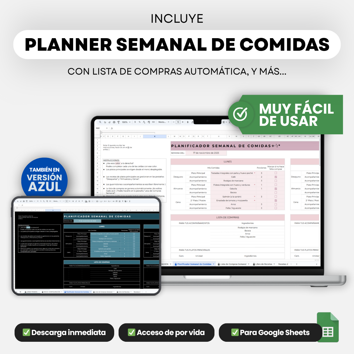 - y un planner semanal en Google Sheets que organiza tus comidas y lista de compras.