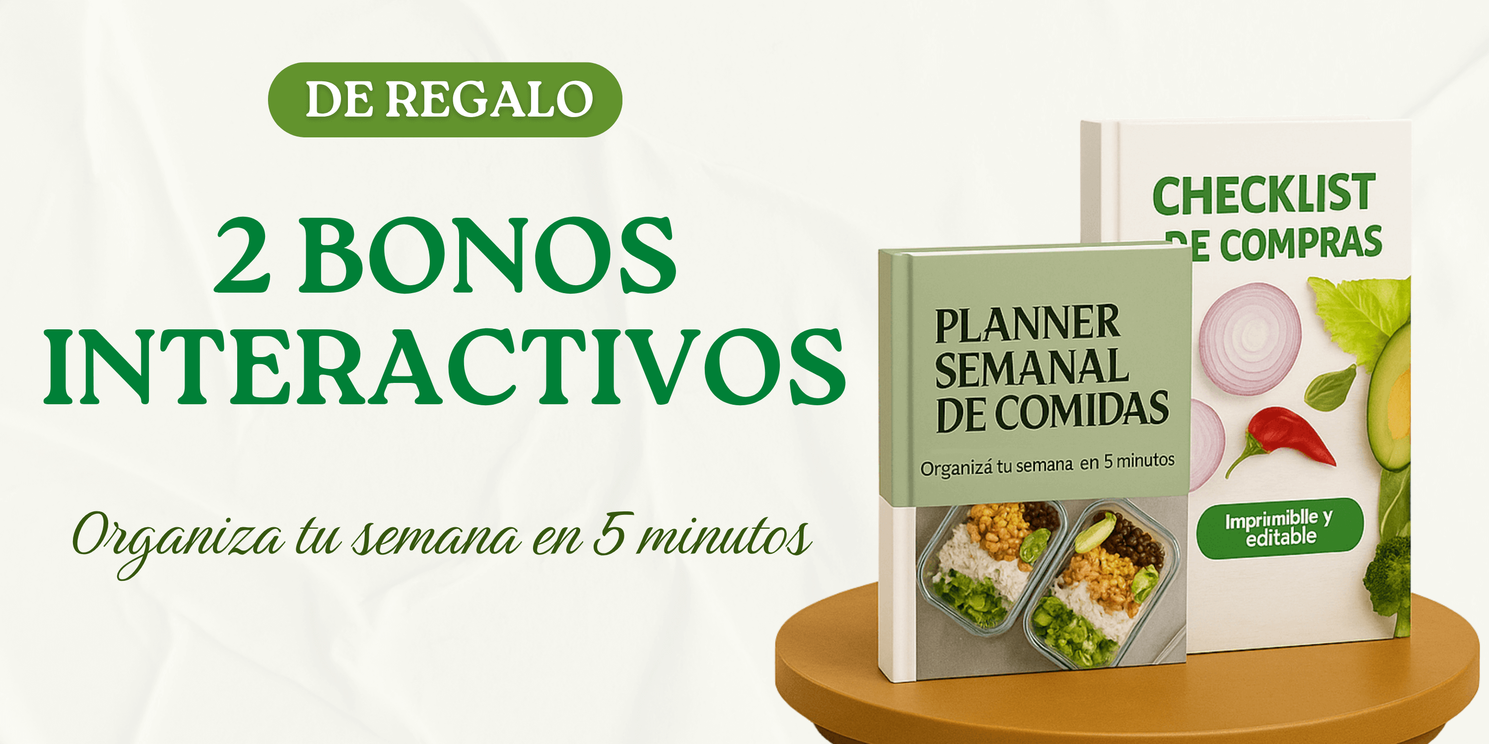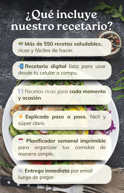 Además del volumen (+550 recetas probadas), está organizado para resolver el “¿qué cocino?” de cada día. No es solo un PDF: con el planner y el checklist convertís las recetas en un sistema simple que ahorra tiempo y plata. Es variedad real, con fotos, tiempos y porciones claras para que salga bien a la primera.
