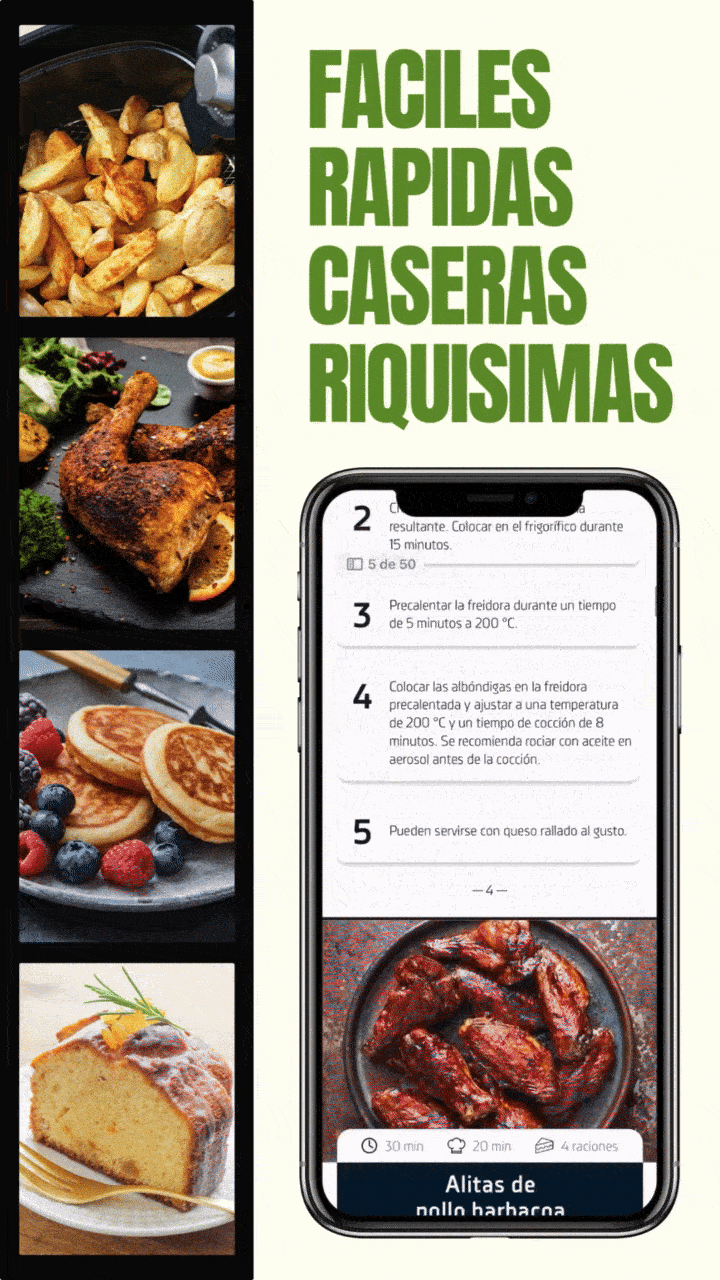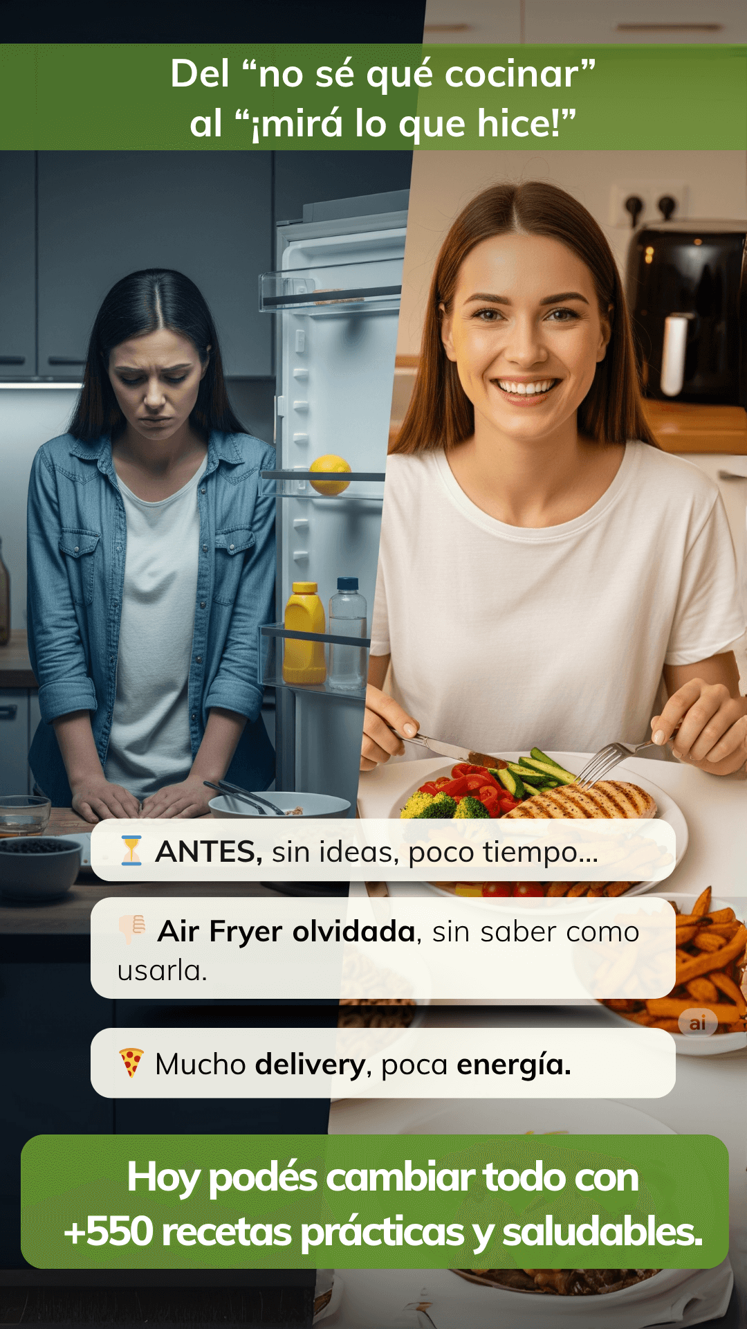 Usamos ingredientes comunes en Argentina. Muchas recetas son más livianas por el uso mínimo de aceite, y en varios casos vas a encontrar alternativas y sugerencias para adaptar a sin gluten o sin azúcar cuando aplica. La idea es comer rico, práctico y mejor sin complicarte.