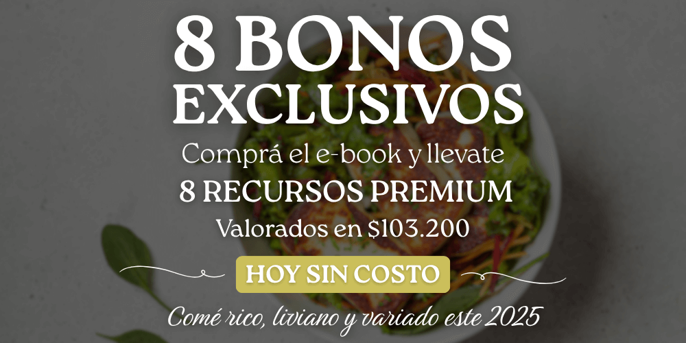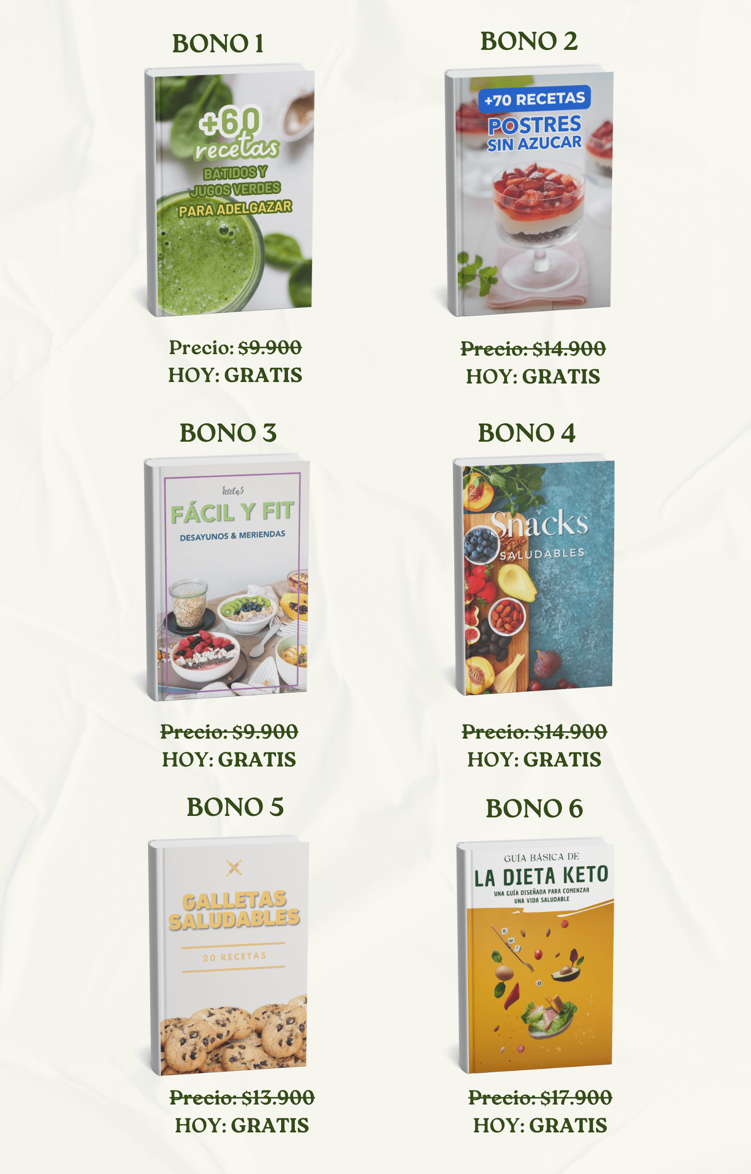 ¡Sí! Además del ebook con 700 recetas saludables sin azúcar y sin gluten, recibirás 5 bonos de regalo exclusivos para complementar tu alimentación saludable: