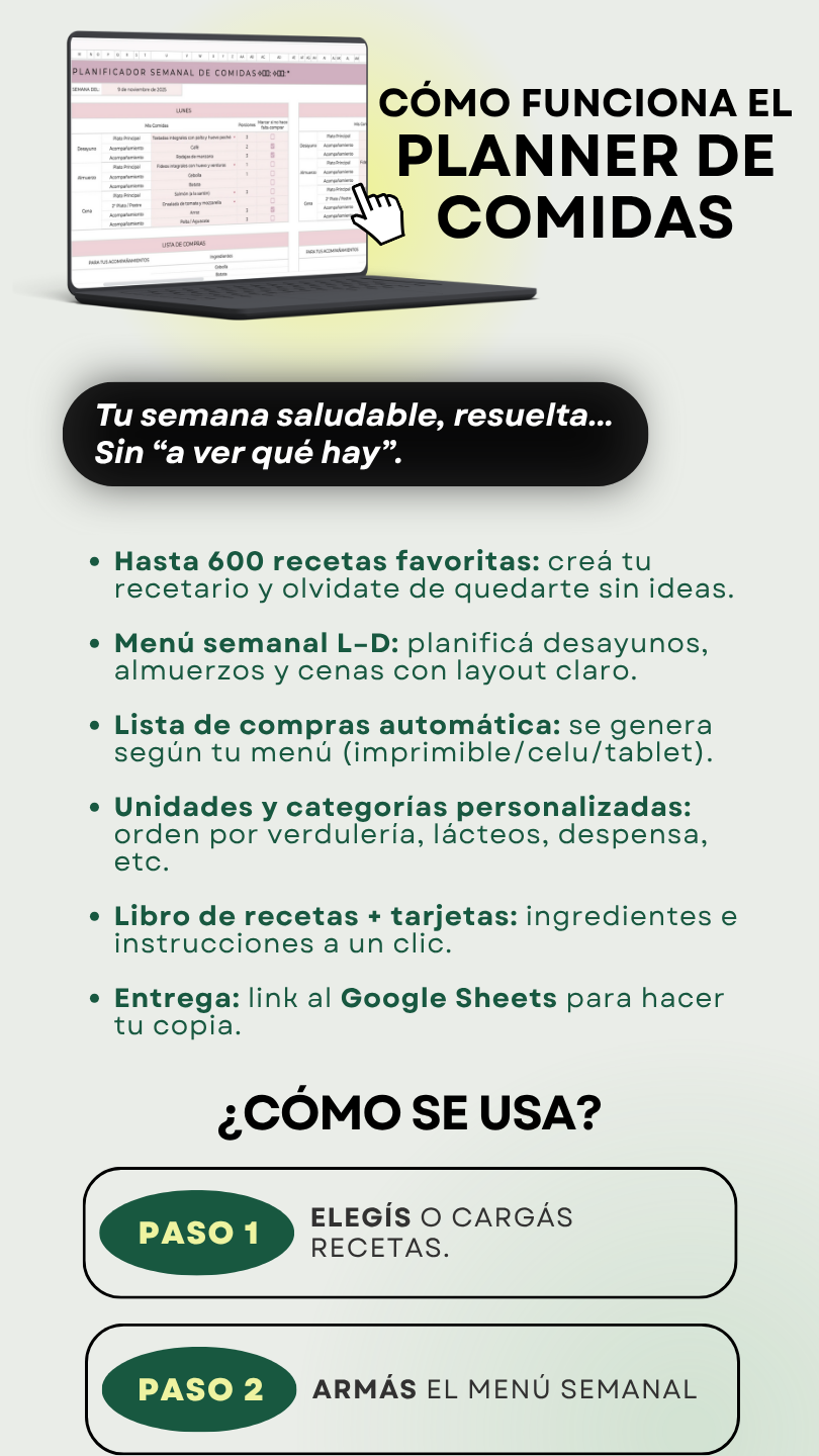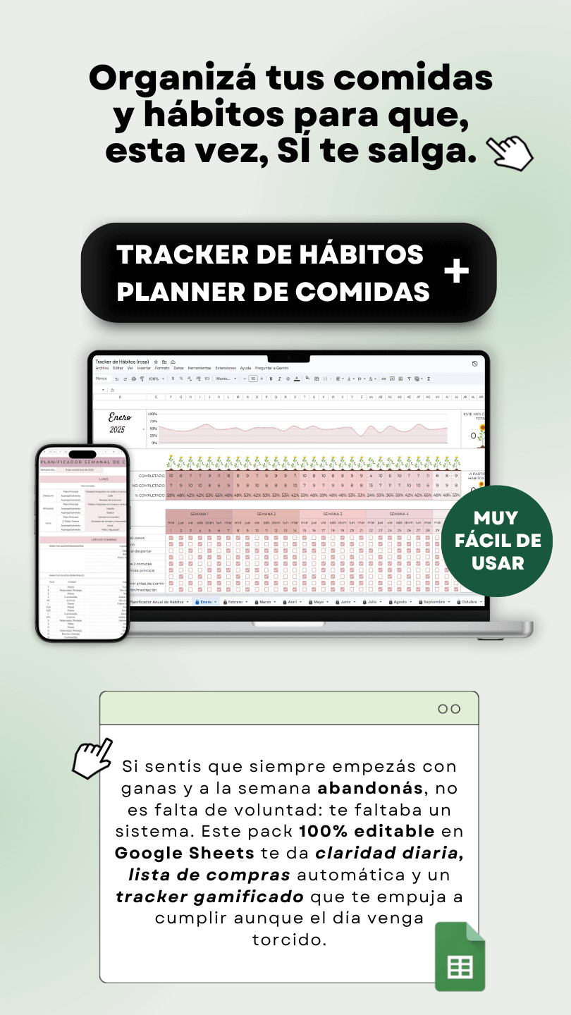 Los abrís desde tu celu o compu, hacés una copia en tu Google Drive y listo, ya tenés tu sistema de organización alimentaria y de hábitos para usar todas las semanas.