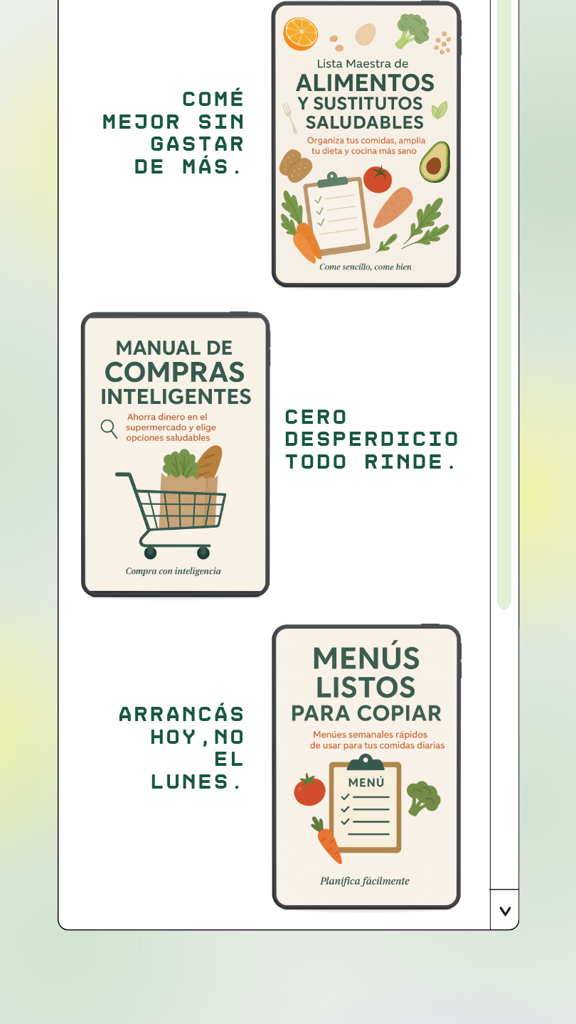 - Bonos ➜ te enseñan cómo planificar sin estrés, comprar inteligente y tener menús listos según tu estilo de vida.